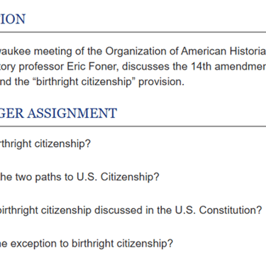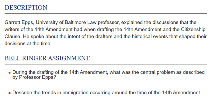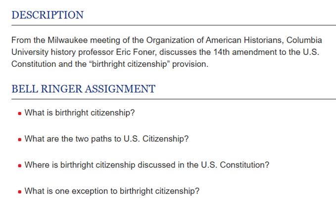 "Bell Ringer: Birthright Citizenship and the Drafting of the 14th Amendment" (video w/bellringer), C-SPAN, Mar 2019, https://www.c-span.org/classroom/document/?9283 (lesson page)