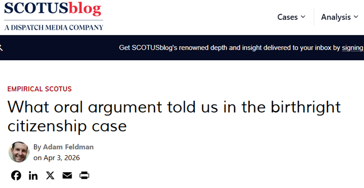 "What oral argument told us in the birthright citizenship case" (article), SCOTUSBlog, Apr 2026, https://www.scotusblog.com/2026/04/what-oral-argument-told-us-in-the-birthright-citizenship-case/