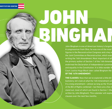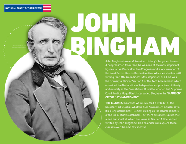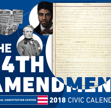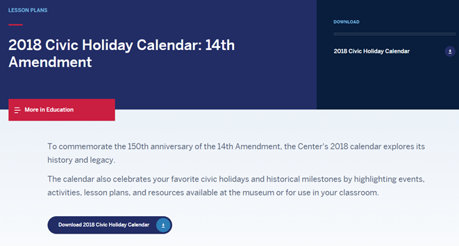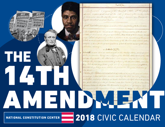 Resources including lesson plans - National Constitution Center, "2018 Civic Holiday Calendar: 14th Amendment" to celebrate the 150th Anniversary of the ratification of the 14th Amendment