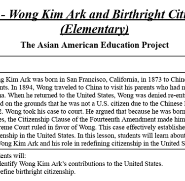 Lesson Plan - The Asian-American Education Project, "Wong Kim Ark and Birthright Citizenship (Elementary)"
