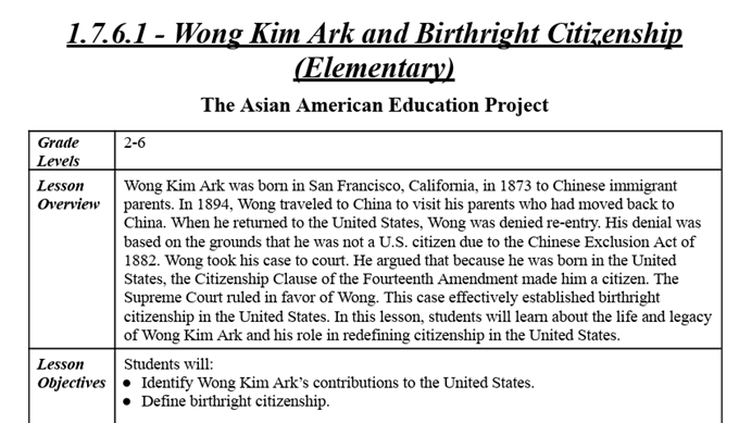 "Wong Kim Ark and Birthright Citizenship (Elementary)" (lesson plan), The Asian American Education Project, 2023, https://asianamericanedu.org/wong-kim-ark-elem.html