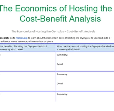 I'll admit a small amount of bias here - I've worked with Ruth Cookson in different settings several times in the past few years (and much more recently) and I know she does a great job on lesson plans that can be immediately used in your classroom. But this was also timely - while much of the focus is on Summer Olympics (since they get the "bigger bucks") it did include up-to-date information for the upcoming Winter Games in northern Italy. I've included a couple of screenshots here, including a look at the cost-benefit analysis worksheet the students would be working on within this lesson: