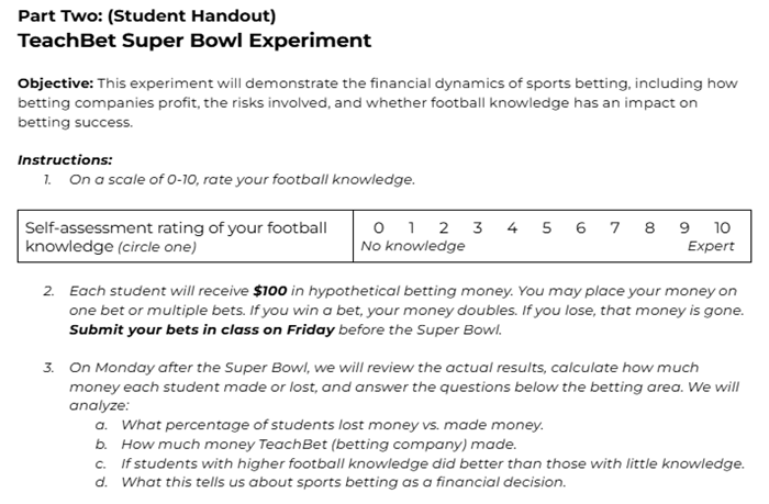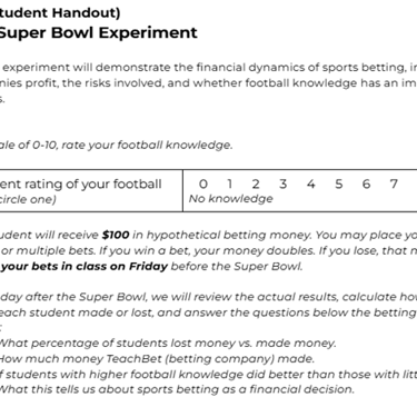 “The Cost of a Super Bowl Bet” (lesson plan), Foundation for Economic Education, https://docs.google.com/document/d/1QAKgxN0IE_tDeAse875JmlQGL3fDReaQ0ghZgiaQbV0
