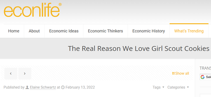 “The Real Reason We Love Girl Scout Cookies”, Econlife, Feb 2022, https://econlife.com/2022/02/girl-scout-cookie-economics/