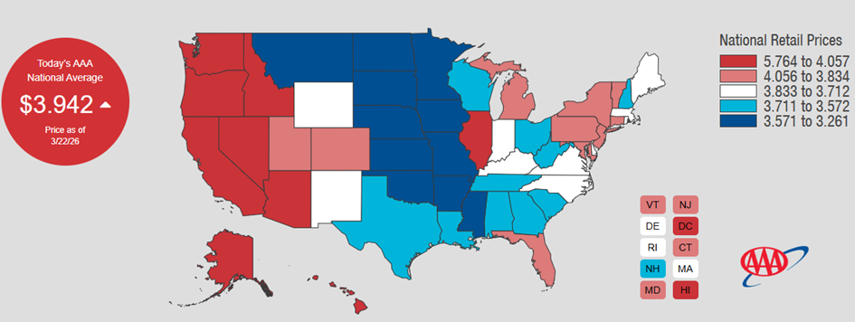 "National average gas prices", AAA Auto Club, Mar 2026, https://gasprices.aaa.com/