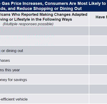 The impacts for consumers are varied - there will be a certain percentage of the population (families and businesses) that will simply plan to pay more and otherwise not change behavior. For many people, though, short-term changes tend to look for ways to adapt or save. This chart is based on a survey done in 2022 at the time of the last major gas price spike (during the spike of inflation that year) but represents a lot of the choices being made by families now - I only listed the responses reported by 10% or more of the respondents: