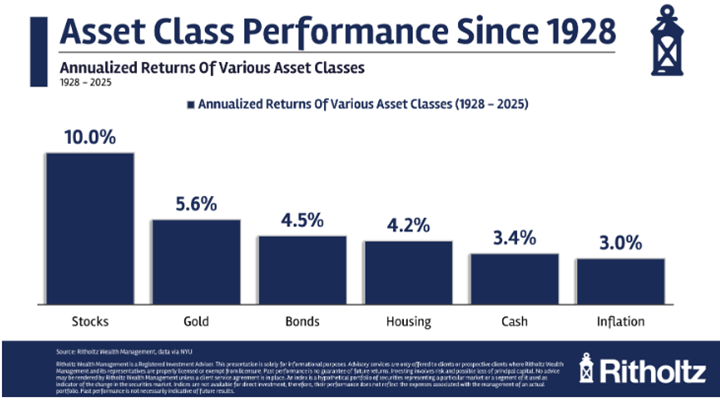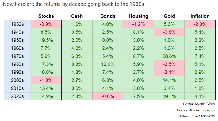 "Historical Returns For Stocks, Bonds, Cash, Housing & Gold (2025)", A Wealth of Common Sense, Jan 2026, https://awealthofcommonsense.com/2026/01/historical-returns-for-stocks-bonds-cash-housing-gold-2025/