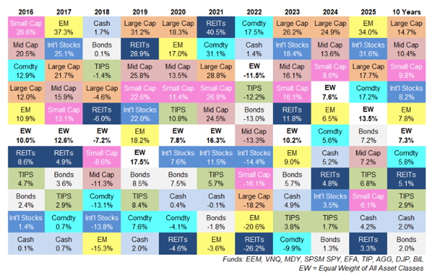 In this final graphic, we see asset returns in 9 different categories ranked (from top to bottom) by performance each year - then a 10-year average at the end. The white squares (marked "EW") reflect an equal weight average of all classes - in other words, if you put 11% of your assets into each of the 9 categories, how would you do?