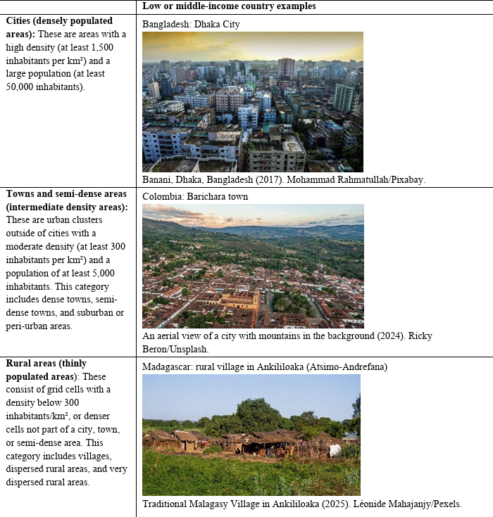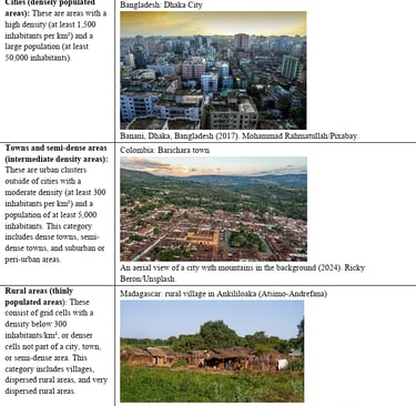 From the UN report - "In 2021, the United Nations Statistical Commission endorsed the Degree of Urbanization (DEGURBA) methodology for international statistical comparisons, which complements - rather than supplants - the national definitions that countries may continue to use for their specific policy needs. This methodology provides a harmonized, spatially based framework for classifying the entire territory of a country along an urban-rural continuum, identifying cities, towns and semi-dense areas, and rural areas based on consistent population size and density thresholds applied globally.