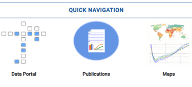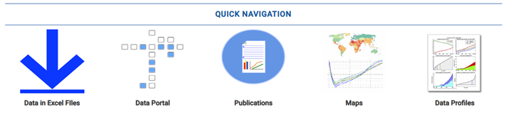 This is the main navigation menu for data from the World Urbanizations Project. You will probably not want (or need) to use the two icons on the left - the "Data in Excel Files" downloads thousands of pages of collected numbers for use in research projects, and similarly the data portal limits how much of that collected data you ask for (like a continent or even specific country) but it is still a lot of data on topics you and your students will probably not be interested in. Instead, let's focus on the three options to the right side: