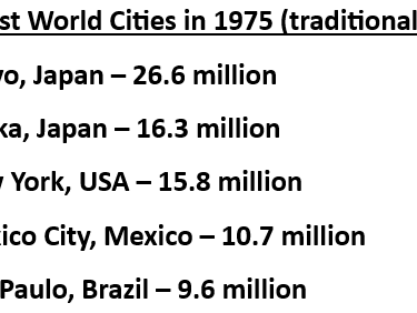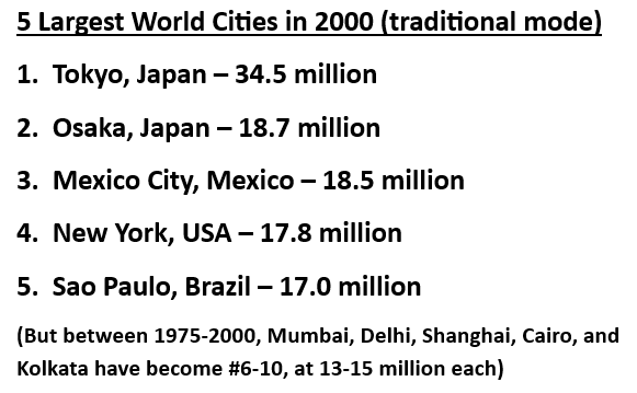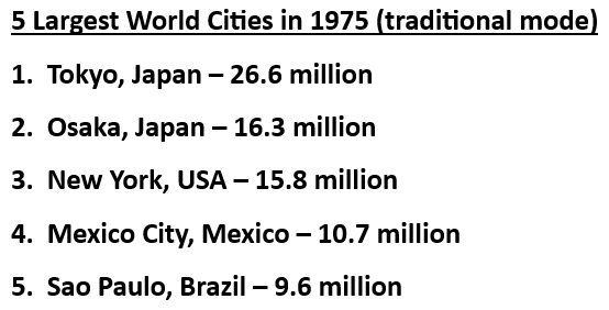 Another point the U.N. report makes, though, is not the number of these cities, but how many of them continue to grow and expand beyond current boundaries. A good way to demonstrate that is a look at the 5 largest cities in the world over different time periods (keep in mind that 1975 and 2000 reflect the old paradigm):