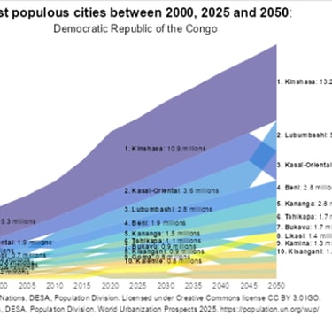 On the left is the same type of data as earlier for the world (city, town, and rural population) except this time it is shown as a total number of people (rather than a percentage), and designed to show rate of increase over time. On the left it has been broken down to just focus on the continent of Africa, with bars showing the percentages of rural (green), towns (dark yellow), and cities (all other colors, broken into sizes of cities). Below, you will see the same kinds of comparisons for a single country, the Democratic Republic of the Congo (one of the fastest growing countries in the world). The country as a whole is on the left - a city breakout on the right.