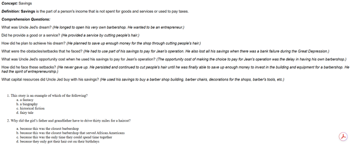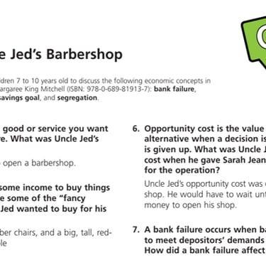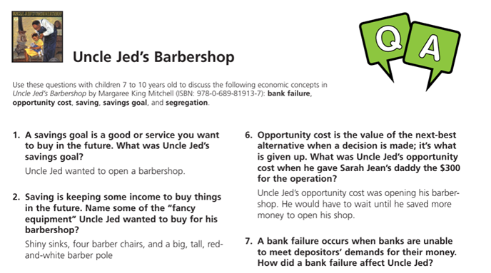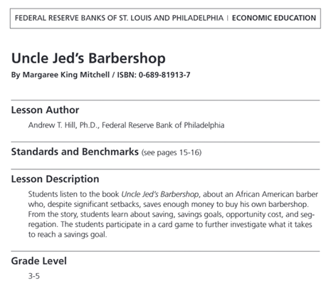 "Uncle Jed's Barbershop" (lesson plan), Federal Reserve Education, 2012, https://www.federalreserveeducation.org/teaching-resources/economics/scarcity/uncle-jeds-barbershop (lesson) AND https://www.federalreserveeducation.org/resources/lessons/lesson--q-and-a-uncle-jeds-barbershop.pdf (parent guide Q&A)