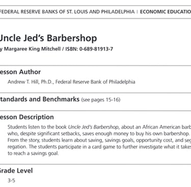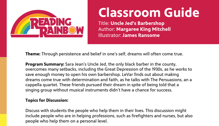 "Uncle Jed's Barbershop" Classroom Guide, PBS's Reading Rainbow, 2023, https://static.pbslearningmedia.org/media/media_files/854982a9-1b6c-461a-96f0-4b324449170b/3bc7c746-b1aa-4d1c-969a-ca94cf69e3d8.pdf