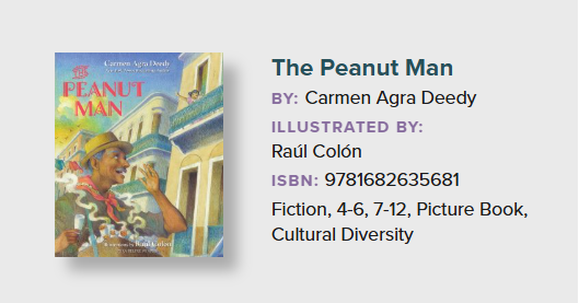 Carmen Agra Deedy writes on a variety of topics and hosts the popular children's program, "Love That Book!" This particular book focuses on a child immigrant from Cuba, but also cultural connections that come from buying and selling of goods (like peanuts, in this case).